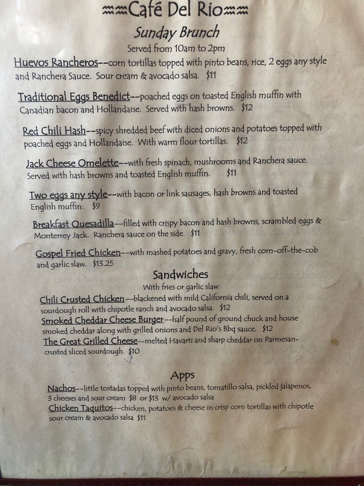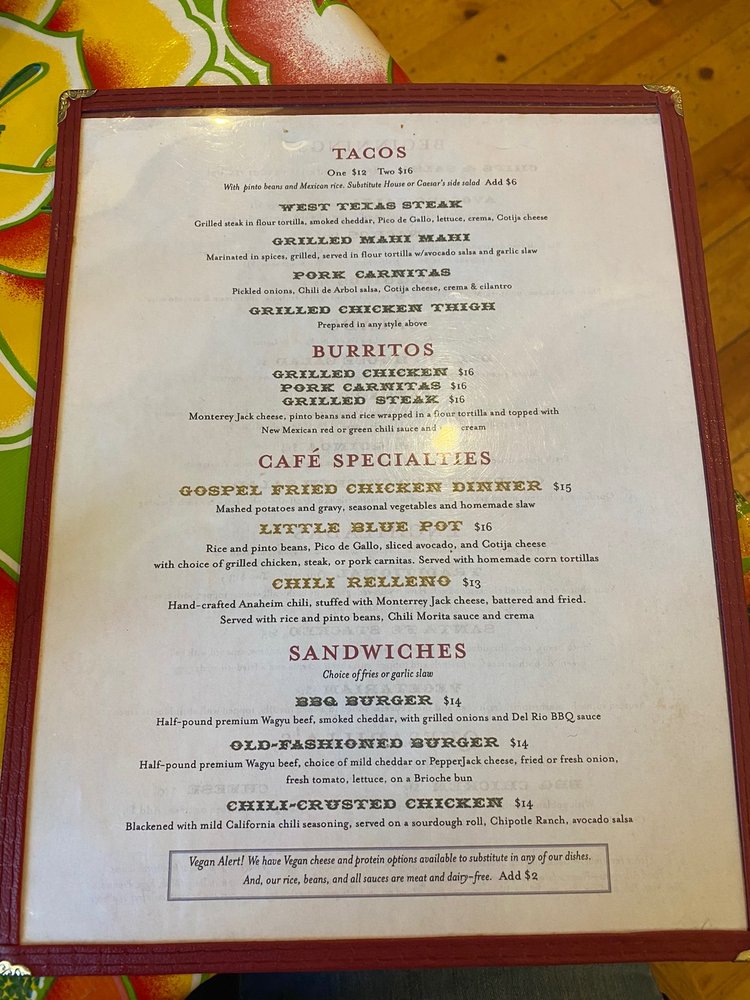 Cafe Del Rio in Virginia City, NV, offers a unique twist on New Mexican cuisine. With a range of options like the Little Blue Pot, Gospel Chicken, Barbacoa Salads, and hand-made tortillas, this restaurant aims to satisfy every palate. The margarita bar is a favorite among patrons, adding to the welcoming atmosphere and attentive service. The dishes are prepared with precision, evident in favorites like the Chili Relleno, Ghost Chicken, and Enchiladas. The relaxed ambiance, friendly staff, and picturesque views make dining here a memorable experience. Whether you're craving Tex-Mex flavors or traditional Mexican dishes, Cafe Del Rio's fresh ingredients and light, bright flavors will surely impress. Don't miss out on their Sunday fried chicken for a delightful twist on the menu. Overall, this women-owned establishment provides a satisfying dining experience with a touch of small-town charm.